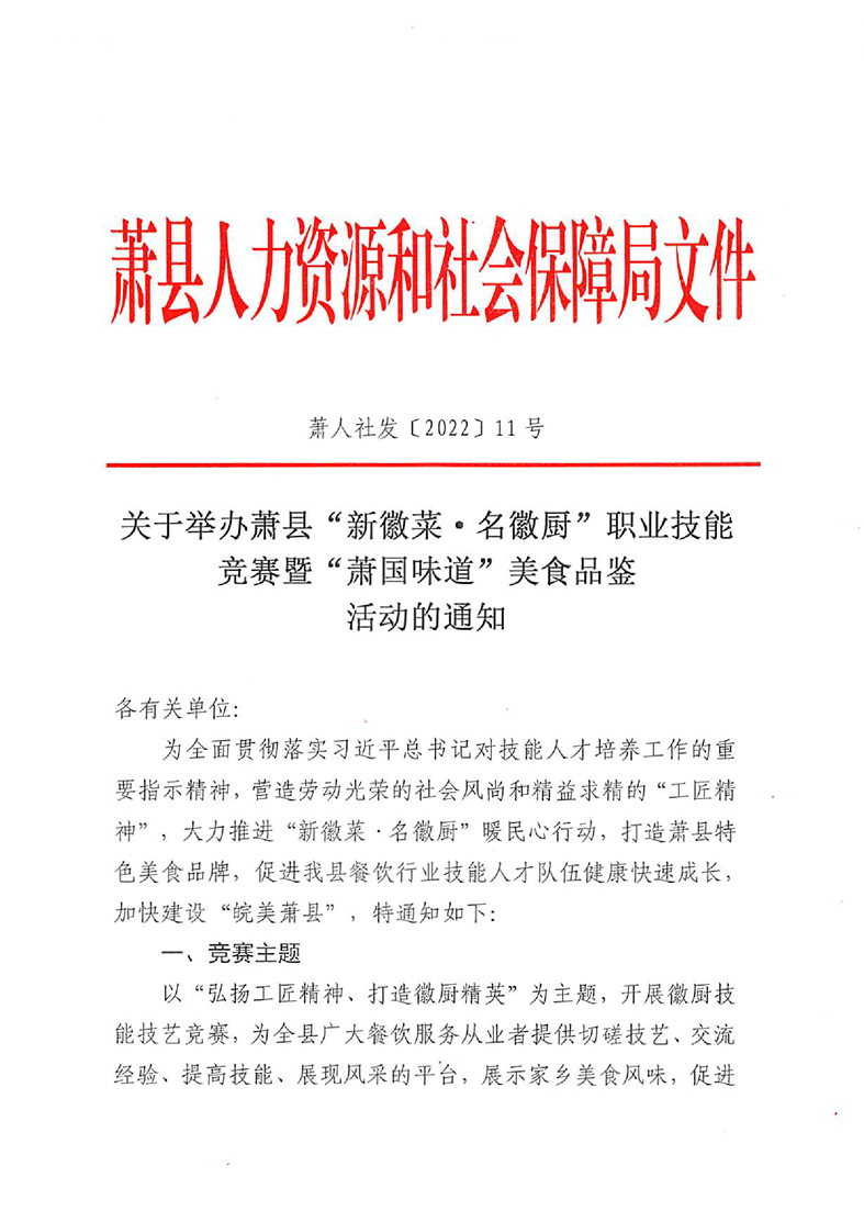 关于举办beat365官方网站正规_365bet注册送奖金_bt365开户“新徽菜·名徽厨”职业技能竞赛暨“萧国味道”美食品鉴活动的通知