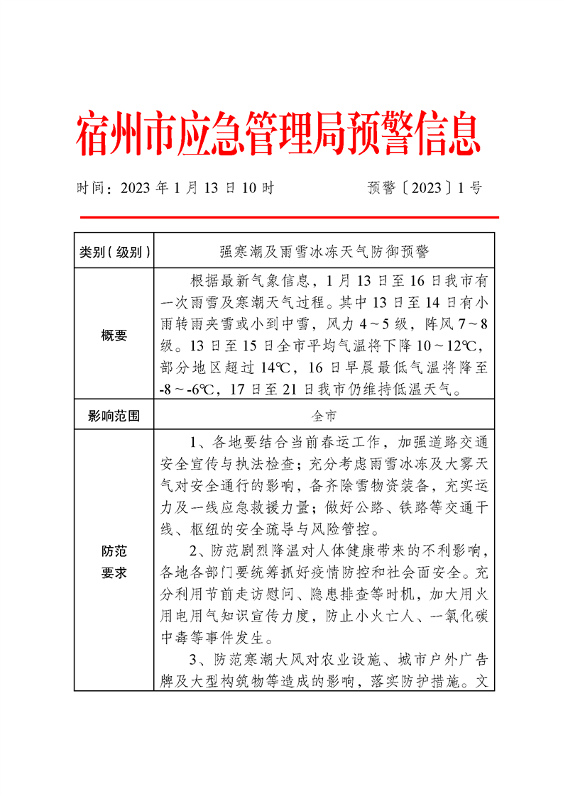 强寒潮及雨雪冰冻天气防御预警