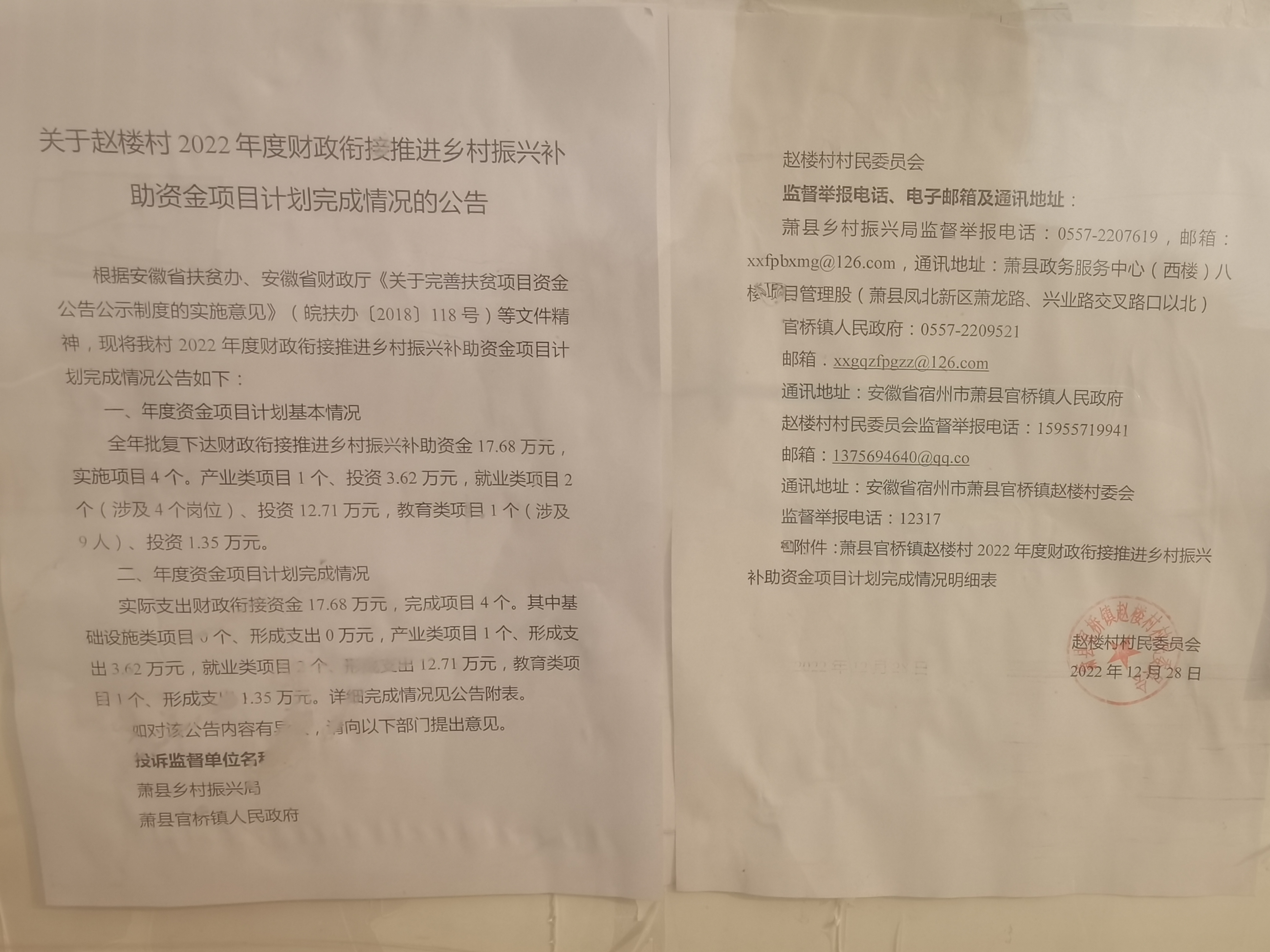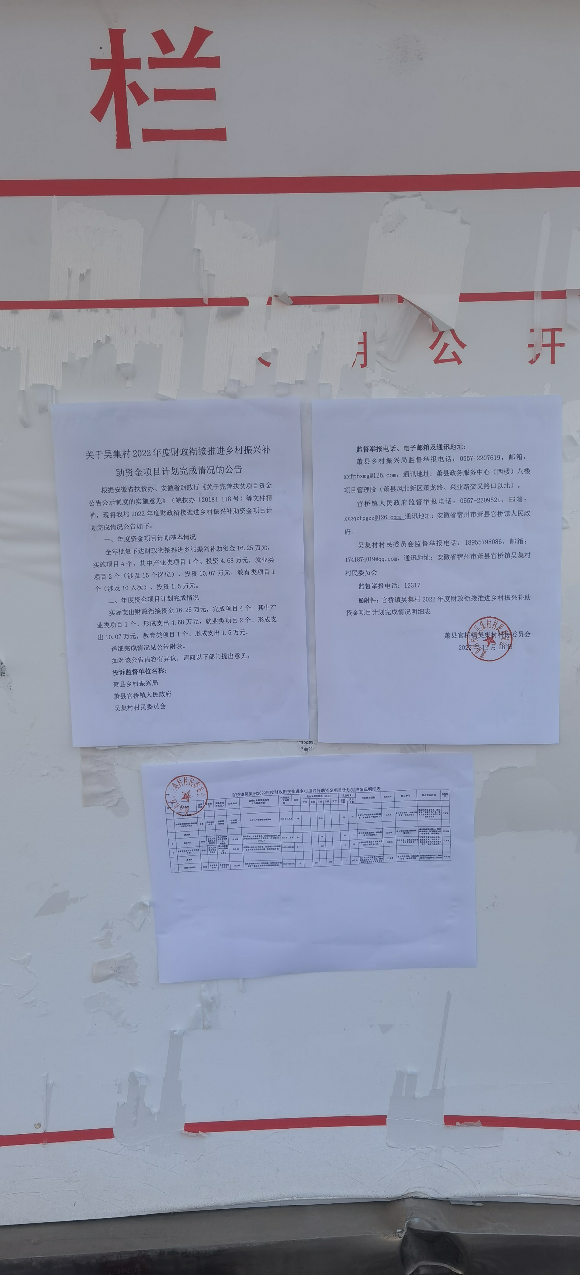 根据安徽省扶贫办、安徽省财政厅《关于完善扶贫项目资金公告公示制度的实施意见》(皖扶办〔2018〕118号)等文件精神,现将我官桥镇2022年度财政衔接推进乡村振兴补助资金项目计划完成情况公告如下:
