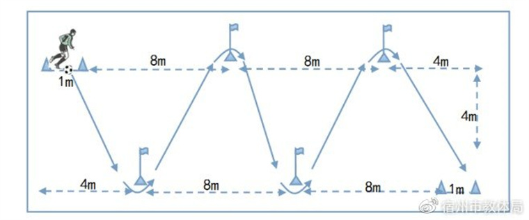 6.足球折线运球。平整的人工草或天然草足球场,22米×5米区域。起点终点距离20米,标志杆宽间距4米,长间距8米。听测评员口令后,受试者从起始线开始运球,分别绕过标志杆外侧,冲过终点线。运球启动开表,运球冲过终点停表。测评员记录其所用时间。以秒为单位记录测试成绩,精确到小数点后1位,小数点后第二位数按非“0”进“1”原则进位。每名考生可连续测试两次,取最好成绩。