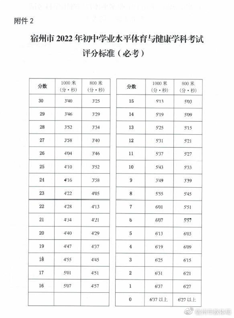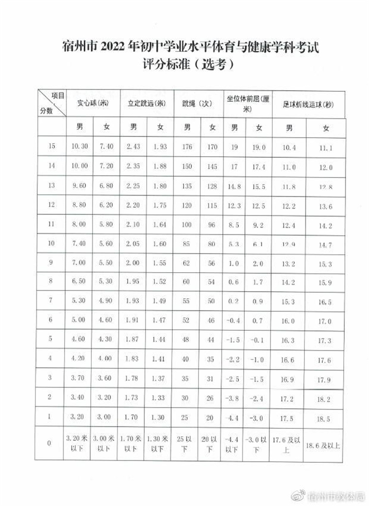 2022年宿州市初中学业水平体育与健康学科考试