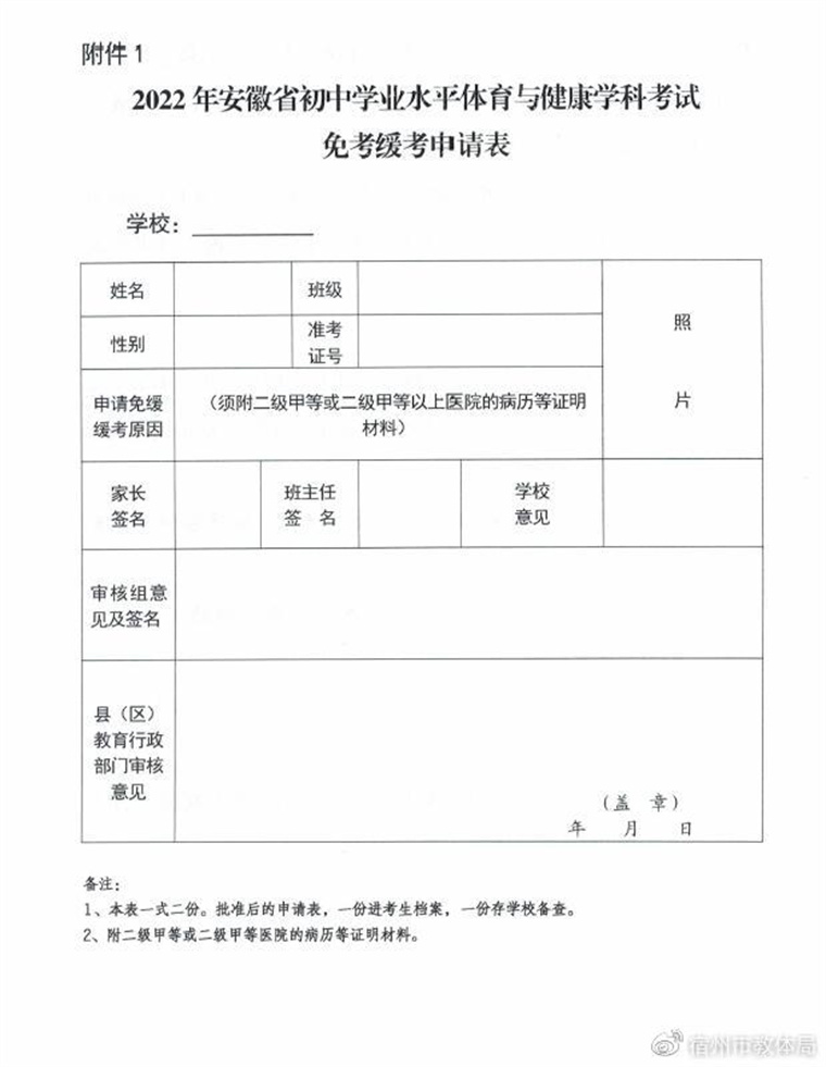 1.因肢残、伤病免修体育课且不能参加初中学业水平体育与健康学科考试的考生,均应填写《安徽省初中学业水平体育与健康学科考试免考缓考申请表》(附件1),办理免考手续。