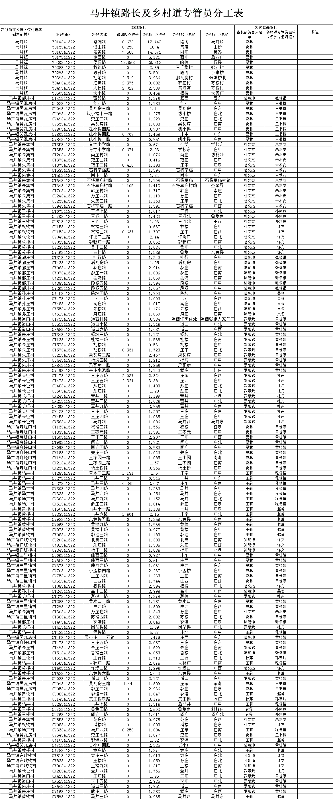 【安全和养护管理信息】马井镇路长及乡村道专管员分工表