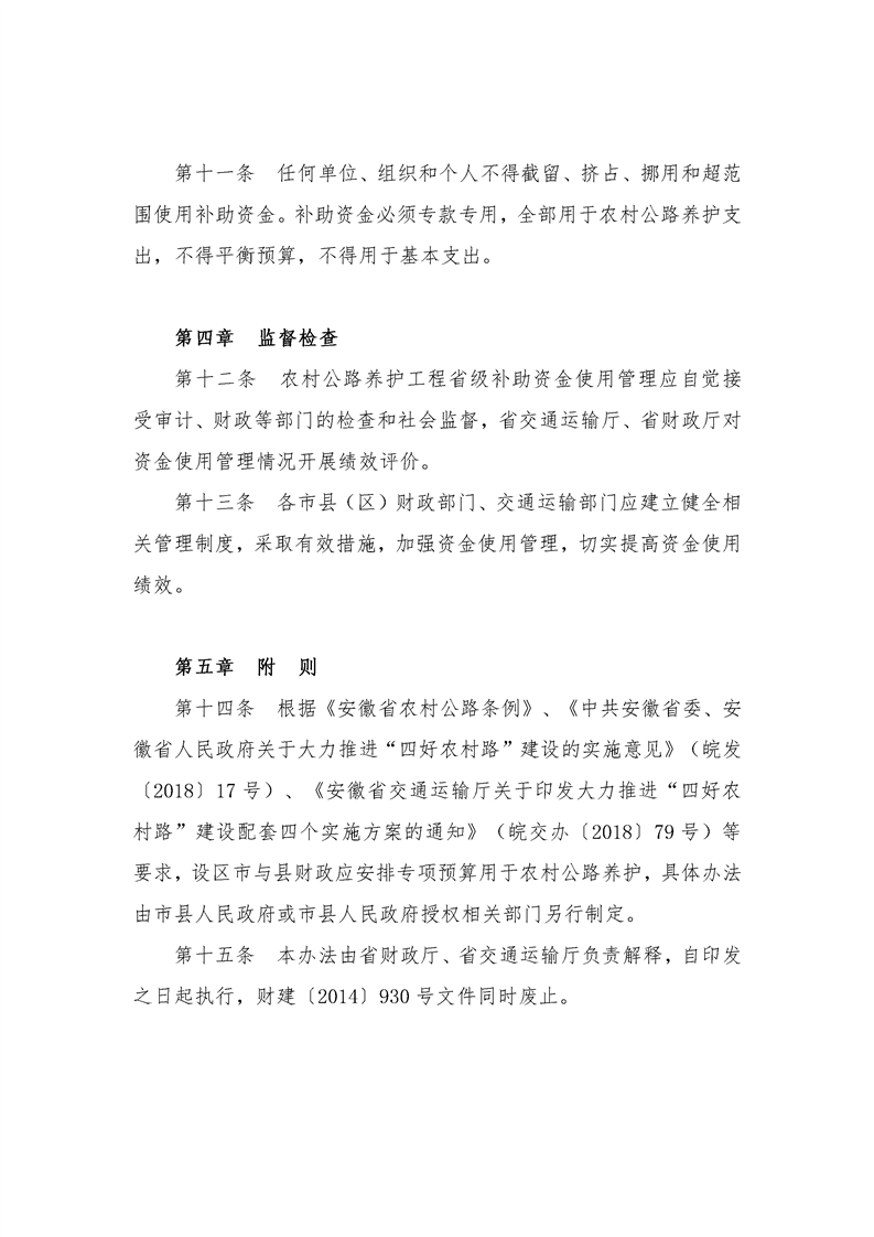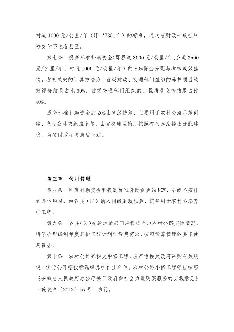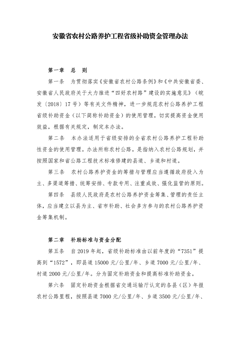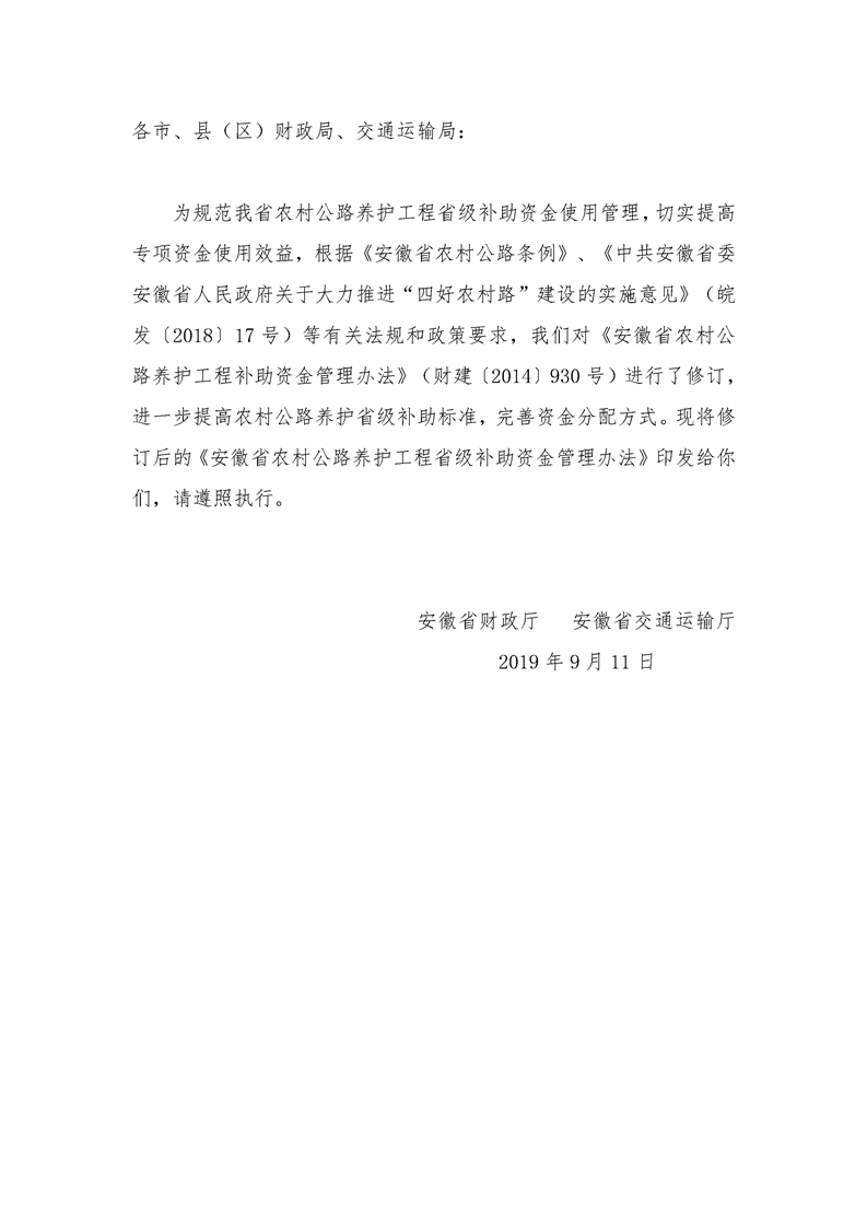 【补助政策信息】安徽省财政厅安徽省交通运输厅关于印发《安徽省农村公路养护工程省级补助资金管理办法》的通知