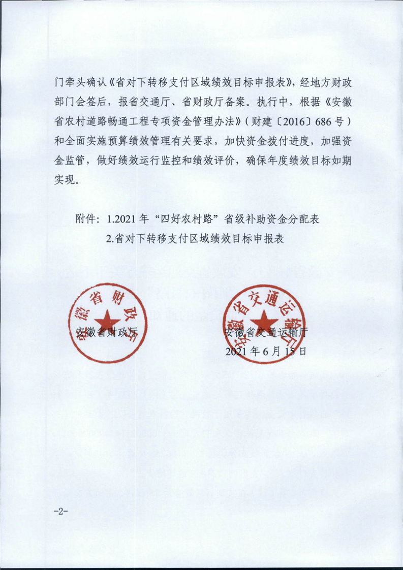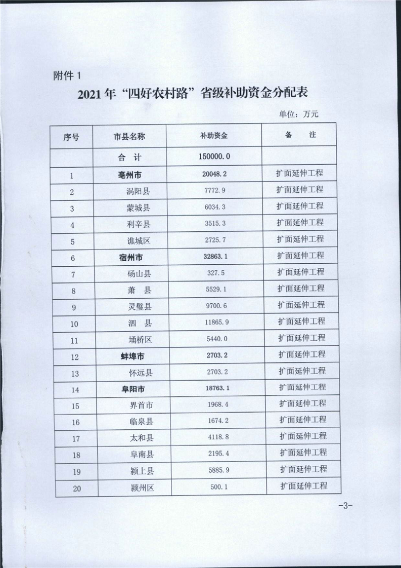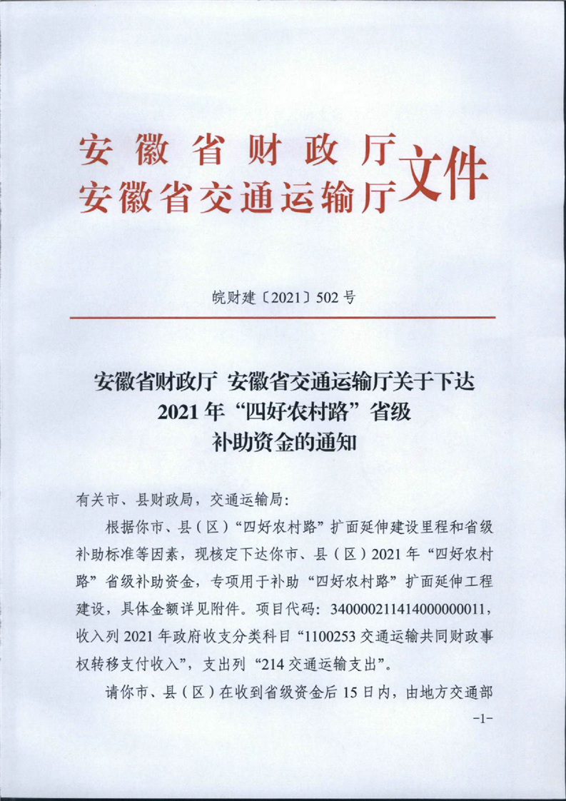【农村公路补助政策信息】安徽省财政厅安徽省交通运输厅关于下达2021年“四好农村路”省级补助资金的通知