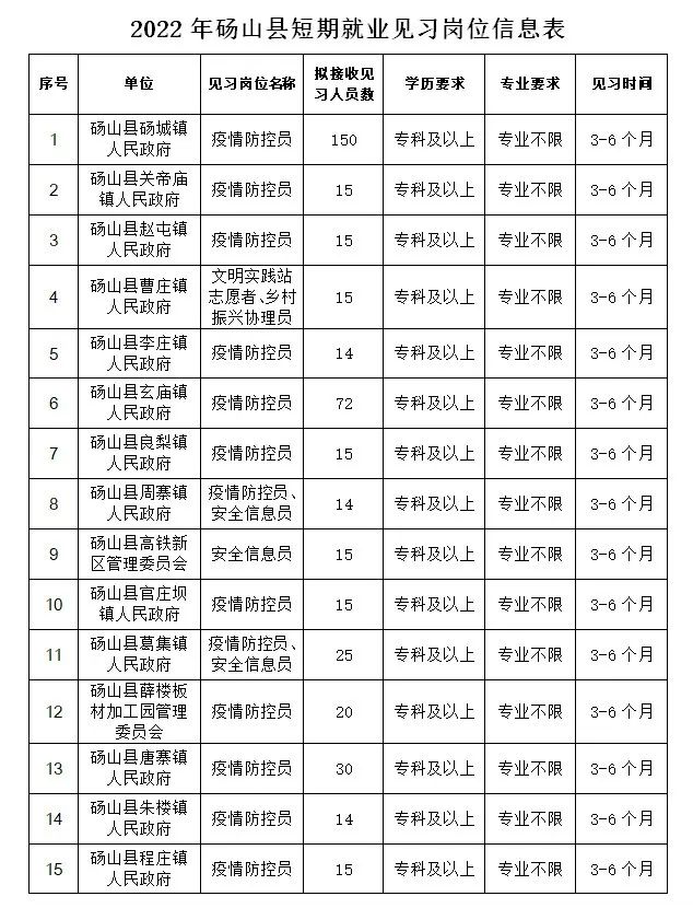 根据安徽省就业工作领导小组办公室《关于加快做好岗位开发促进就业的通知》文件精神,为推进暖民心促就业行动,帮助高校毕业生加强岗位实践锻炼、提升就业能力,现就2022年招募砀山县短期就业见习人员有关事项公告如下: