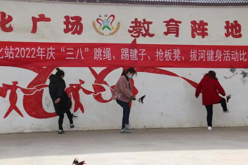 2022年3月8日,永堌镇文化站2022年庆“三八”跳绳、踢毽子、抢板凳、拔河健身活动比赛在镇文化广场举行,我镇各村妇女代表98人参加。
