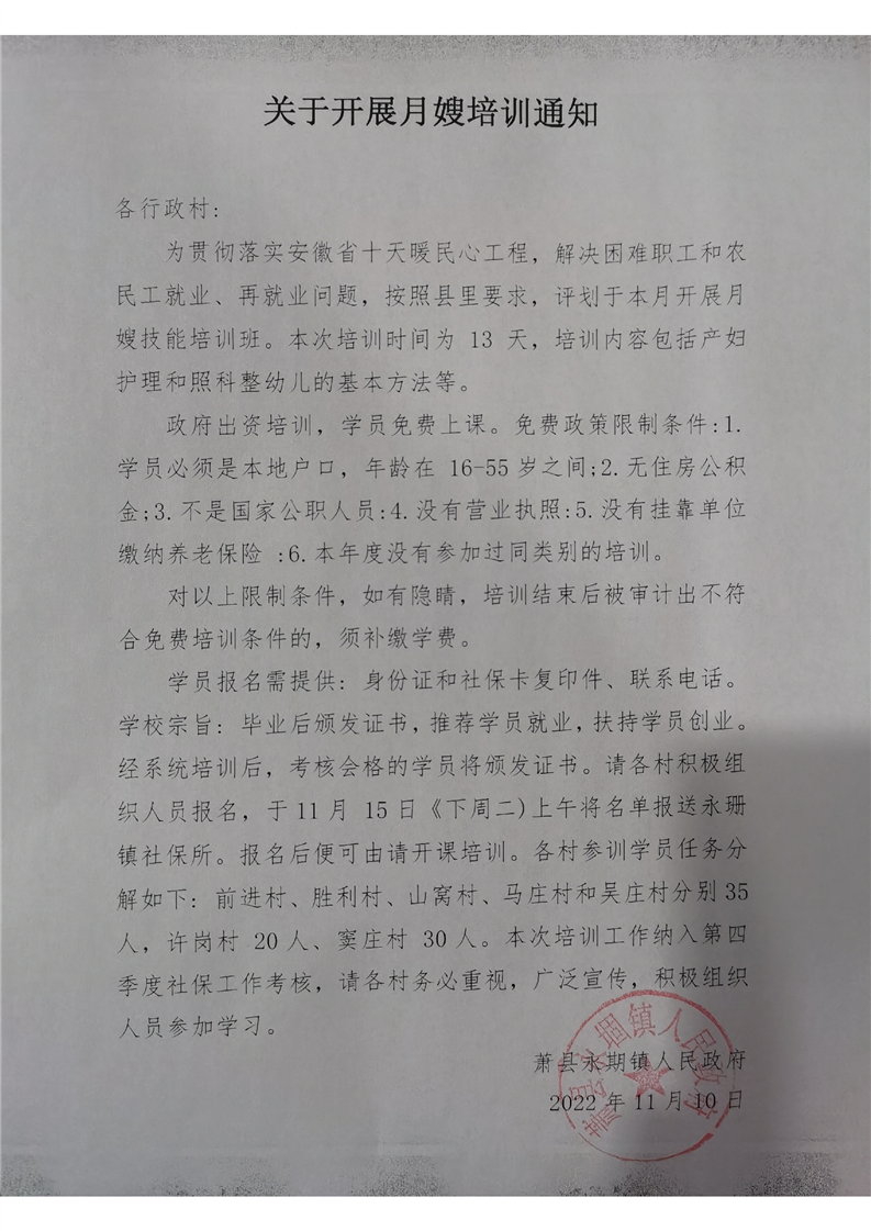 【职业培训信息】永堌镇关于开展月嫂培训通知