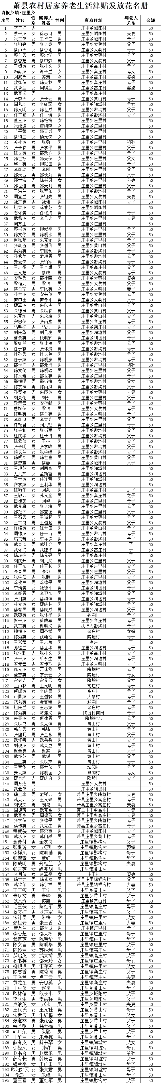 2022年12月庄里镇农村居家养老生活津贴发放花名册