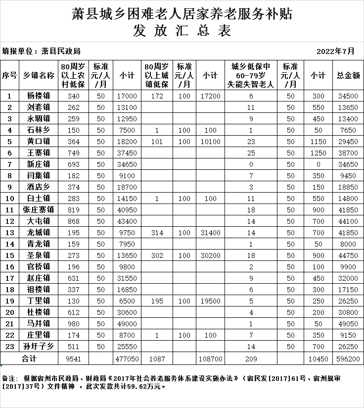2022年7月居家养老生活服务补贴发放汇总表