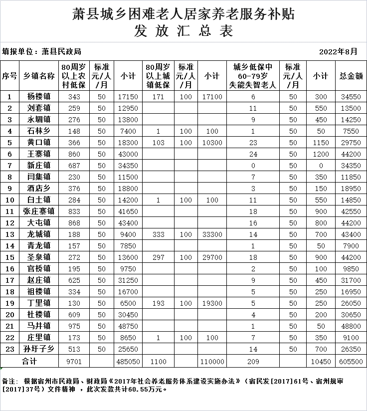 2022年8月居家养老生活服务补贴发放汇总表