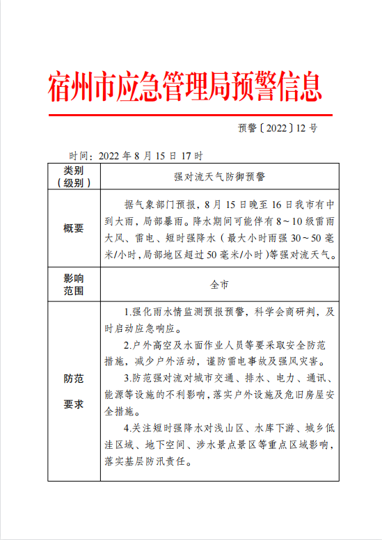 宿州市应急管理局预警信息