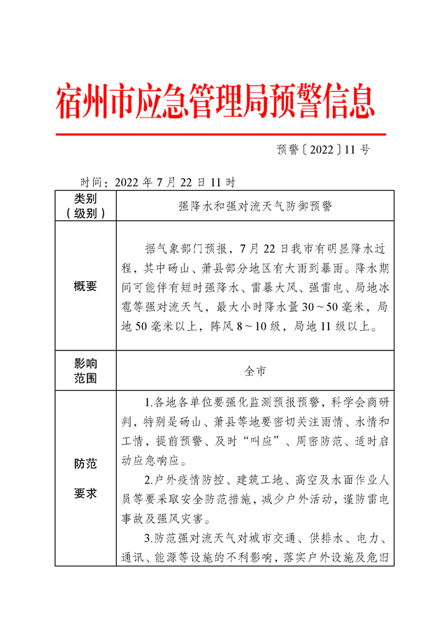 宿州市应急管理局预警信息-预警〔2022〕11号