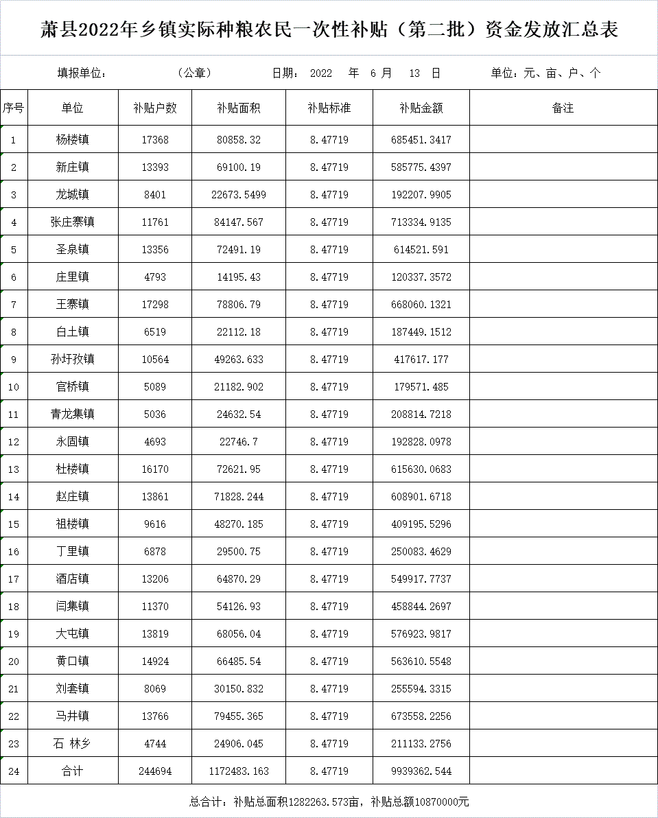 beat365官方网站正规_365bet注册送奖金_bt365开户2022年乡镇实际种粮农民一次性补贴(第二批)资金发放汇总表