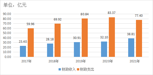 全年财政总收入38.8亿元,比上年增长20.9%,其中,一般公共预算收入23.5亿元,增长5.2%。其中,增值税7.3亿元,增长25.3%;企业所得税1.3亿元,增长28.7%。一般公共预算支出77.4亿元,下降7.2%。其中,一般公共服务支出5.2亿元,下降0.1%;社会保障与就业支出15.8亿元,下降3.5%;节能环保支出3.0亿元,增长2.6%;教育支出16.8亿元,增长5.3%;卫生健康支出5.4亿元,增长3.0%;城乡社区支出4.5亿元,下降5.5%;农林水支出9.7亿元,增长0.1%;交通运输支出1.0亿元,下降68.1%;科学技术支出0.5亿元,增长4.3%。