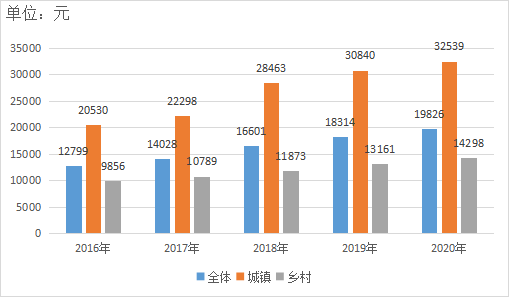 2016-2020年全县全体、城镇、乡村人均可支配收入