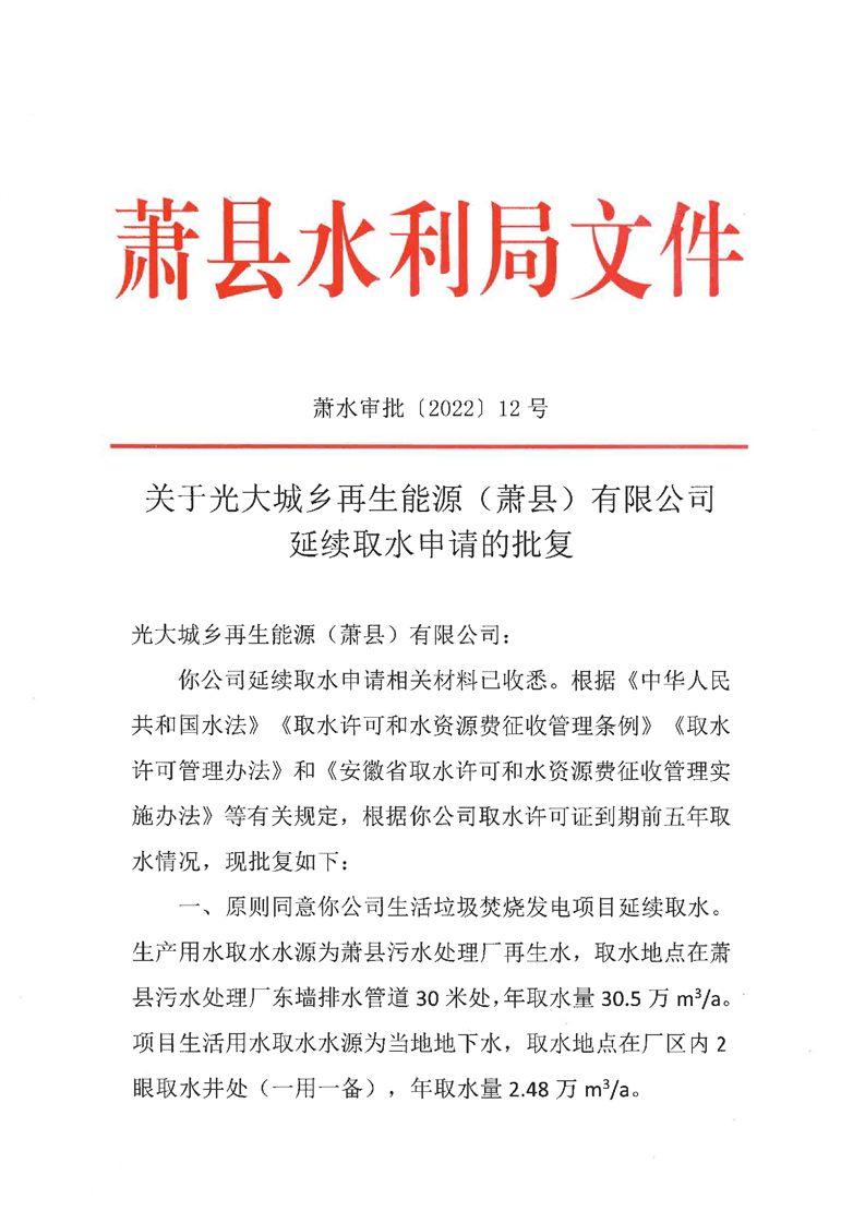 关于光大城乡再生能源(beat365官方网站正规_365bet注册送奖金_bt365开户)有限公司延续取水许可的批复