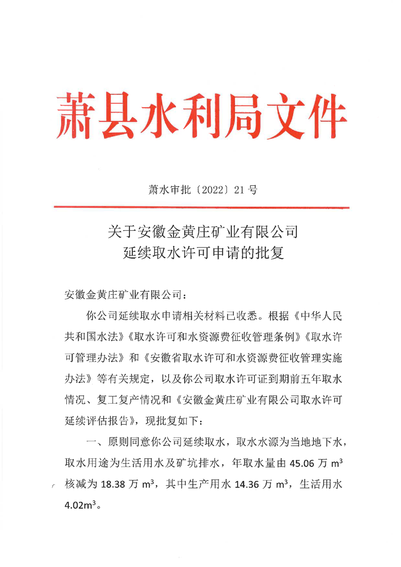 关于安徽金黄庄矿业有限公司延续取水许可申请的批复 |