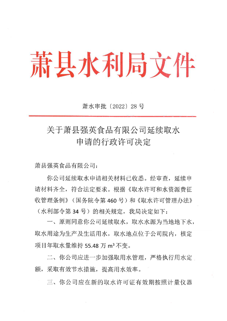 关于beat365官方网站正规_365bet注册送奖金_bt365开户强英食品有限公司延续取水申请的行政许可决定