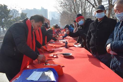 “佳节迎春春生笑脸,丰收报喜喜上眉梢”“兔追日月雄风舞,兔跃山河瑞气生”“万象更新精神焕发,百花齐放春满人间”……一幅幅散发着墨香的春联和福字不一会就展现在人们眼前,红红的春联和福字铺在长长的桌案上,那耀眼的鲜红和浓郁的墨色交相辉映,播撒出无限的美、和谐、奋发、积极、健康和快乐,既有喜迎兔年辞旧迎新的美好愿景,也有歌颂党恩、宏图大展的励志高歌,为即将到来的新春佳节增添了浓浓的喜庆氛围。