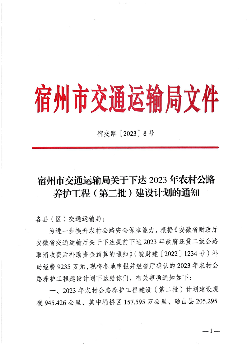 宿州市交通运输局关于下达2023年农村公路养护工程(第二批)建设计划的通知 |
