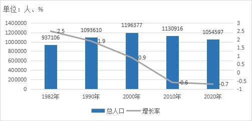 全县常住人口[2]为1054597人,与2010年第六次全国人口普查的1130916人相比,减少76319人,下降6.7%,年平均下降0.7%。
