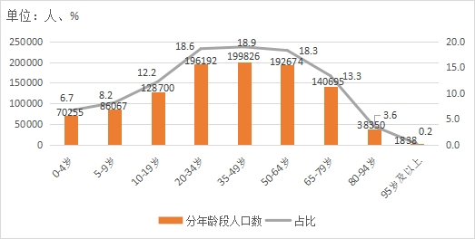 全县常住人口中,0-14岁[4]人口为237051人,占22.5%;15-59岁人口为596728人,占56.6%;60岁及以上人口为220818人,占20.9%,其中65岁及以上人口为180883人,占17.2%。与2010年第六次全国人口普查相比,0-14岁人口的比重上升2.3个百分点,15-59岁人口的比重下降6.9个百分点,60岁及以上人口的比重上升4.6个百分点,65岁及以上人口的比重上升5.8个百分点。